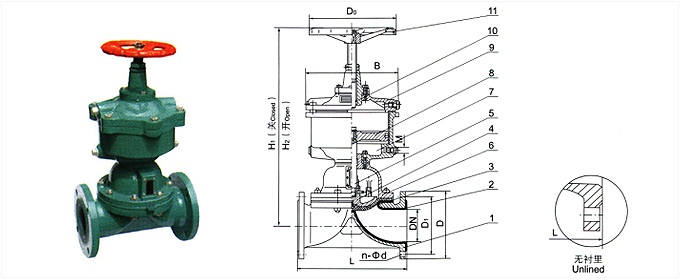 部件列表: 1、閥體 2、閥體襯里 3、隔膜 4、閥瓣 5、下閥桿 6、閥蓋 7、氣缸 8、活塞 9、氣缸蓋 10、上閥桿 11、手輪