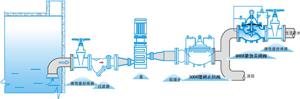 900X緊急關(guān)閉閥用于生活供水和消防供水并聯(lián)供水系統(tǒng)中,正常情況供生活用水,當(dāng)火災(zāi)發(fā)生時(shí)消防用水時(shí),閥門自動(dòng)關(guān)閉生活用水,確保足夠的消防用水。當(dāng)消防停止用水時(shí)壓力減少,閥門自動(dòng)恢復(fù)生活用水,該閥使系統(tǒng)無須另設(shè)專門的消防單獨(dú)供水管網(wǎng),大大地節(jié)省了工程建設(shè)成本和日常的用水量。該閥控制靈敏、可靠、調(diào)試簡單、使用壽命長。