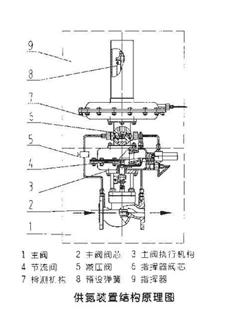 供氮裝置結構如右圖所示,將設在罐頂的取壓點的介質經導壓管引入檢測機構(7)、介質在檢測元件上產生一個作用力與彈簧(8)、預緊力相平衡。當罐內壓力降低到低于供氮裝置壓力設定點時,平衡被破壞,使指揮器閥芯(6)打開,從而使閥前氣體經減壓閥(5)、節(jié)流閥(4)、進入主閥執(zhí)行機構(3)上、下膜室,打主開閥閥芯(2)、向罐內充注氮氣;當罐內壓力升到供氮裝置壓力設定點時,由于預設彈簧力,關閉指揮器閥芯(6)又由于主閥執(zhí)行機構中彈簧作用,關閉主閥,停止供氮。