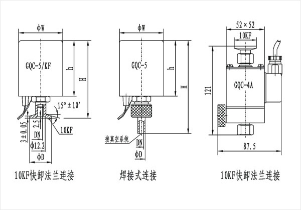 GQC-1.5 GQC-5型電磁高真空充氣閥是以電磁力為動力,當(dāng)接通電源時,閥門被關(guān)閉,使真空系統(tǒng)與大氣隔離;切斷電源時,閥門處于開啟狀態(tài),隨之大氣由外界引入真空系統(tǒng)。GQC-4A型電磁高真空充氣閥具有通電開啟和通電關(guān)閉兩種功能,閥內(nèi)帶有空氣過濾器,可用作向真空系統(tǒng)充氣。